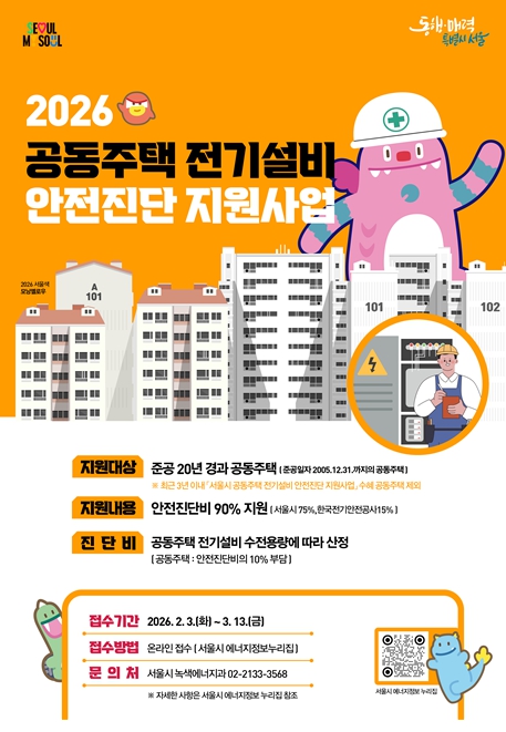 [메이저뉴스]서울시는 노후 공동주택의 정전사고를 사전에 차단하고, 시민 생활안전을 강화하기 위해 ‘2026년 공동주택 전기설비 안전진단 지원사업’을 추진한다. 한국전기안전공사와 협력해 공동주택 전기설비의 적정 운전·관리 상태를 종합 진단하고, 진단비의 90%를 지원한다.