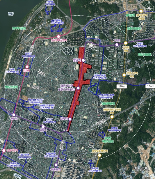 대상지는 강동구의 일상생활 중심 거리이자 남·북을 연결하는 중심축인 양재대로 일대로, 지하철 5호선 길동역·굽은다리역·명일역을 포함한 역세권 구간이 해당된다. 양재대로변에는 상업·근린생활시설이 주로 배치되고 이면부에는 저층 주거지가 분포하여 다양한 생활기능이 함께 분포하는 지역이다.