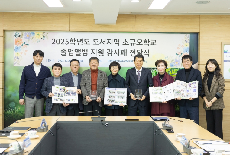 [메이저뉴스]인천남부교육지원청은 26일 남부 도서학교 졸업앨범 무료 제작에 협력한 인천사진앨범인쇄협동조합, 푸르미재단, 기호일보와 함께 전수식 및 감사패 전달식을 개최했다.