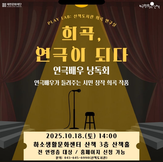[메이저뉴스]제천문화재단(이사장 김상수)이'2025년 문학상주작가 지원사업'의 일환으로 상주작가와 마지막 문학프로그램인 '희곡, 연극이 되다' 연극배우 낭독회를 오는 18일 하소생활문화센터 산책에서 선보인다.