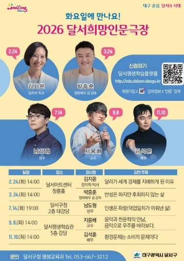 [메이저뉴스]대구 달서구는 2월 24일 오후 2시 달서아트센터 청룡홀에서 김지윤 정치학 박사의 강연을 시작으로 '2026 달서희망인문극장'을 본격 운영한다.