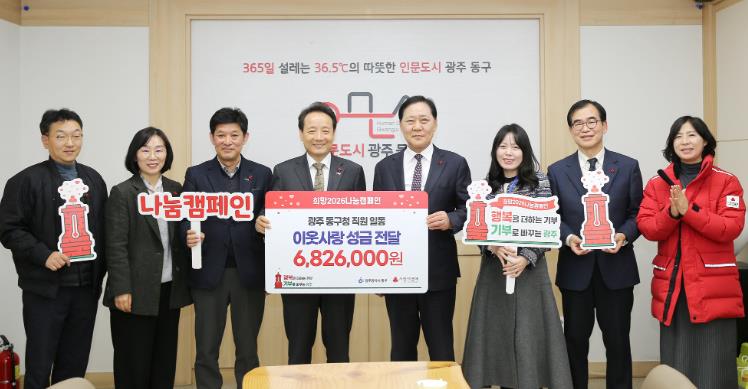 [메이저뉴스]광주 동구는 지난 6일 구청 접견실에서 ‘희망 2026 나눔캠페인 직원 성금 전달식’을 갖고, 직원들의 자발적인 참여로 모금한 성금을 광주사회복지공동모금회에 전달했다고 밝혔다.