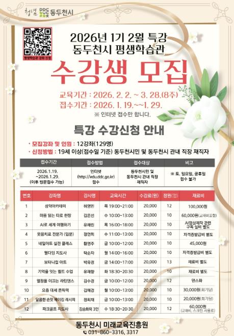 수강 신청은 2026년 1월 19일부터 1월 29일까지이며, 인터넷 접수로만 진행된다. 자세한 사항은 동두천시 평생학습관 홈페이지에서 확인할 수 있다.