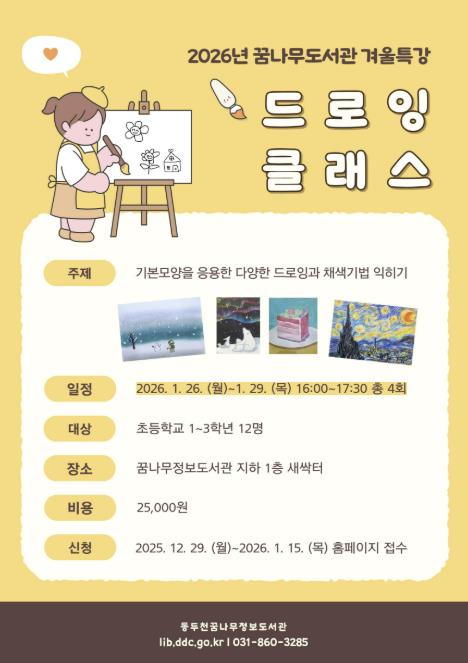 오는 2026년 1월 26일부터 29일까지는 ‘미술학원 대신 도서관 가자! 즐거운 그리기 교실’을 운영한다. 해당 프로그램은 12명을 대상으로 오후 4시부터 오후 5시 30분까지 진행되며, 책 읽기를 바탕으로 풍경화·정물화·명화 등을 수채 물감과 오일 파스텔로 표현해 보는 수업이다. 이를 통해 미술 교과 과정에 부합하는 다양한 표현 기법을 익힐 수 있도록 구성했다.