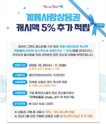 이응우 계룡시장은 “코리아 그랜드 페스티벌과 연계한 이번 캐시백 혜택이 지역상권 활성화에 실질적인 도움이 되길 바란다”며 “많은 시민들이 지역 내 소비에 적극 동참해 활기찬 지역경제를 만들어가길 기대한다”고 말했다.