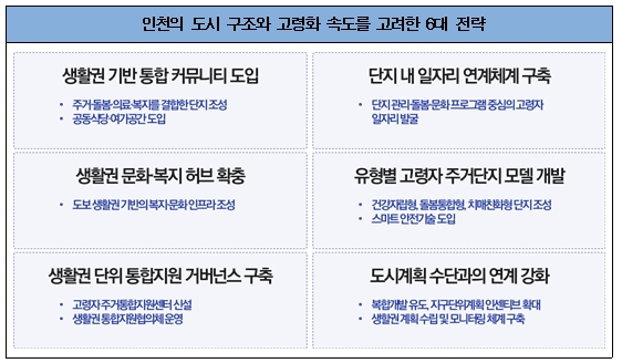 인천연구원은 인천의 도시 구조와 빠른 고령화 속도를 고려해 생활권 기반 통합 커뮤니티 도입, 단지 내 고령자 일자리 연계, 생활권 문화·복지 허브 확충, 유형별 고령자 주거단지 모델 개발, 생활권 단위 통합지원 거버넌스 구축, 도시계획 수단과의 연계 강화 등 여섯 가지 전략을 제안했다.
