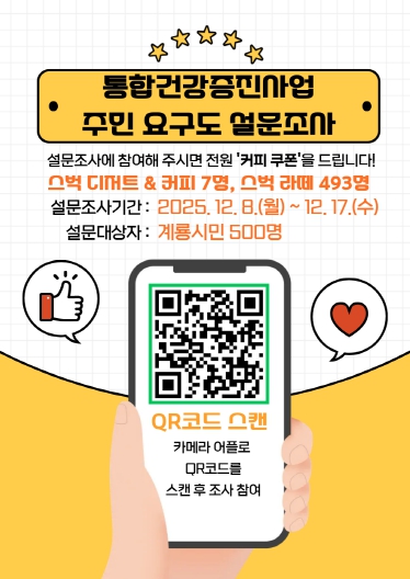 [메이저뉴스]계룡시는 시민 건강증진을 위해 ‘2025년 통합건강증진사업 지역주민 설문조사’를 12월 8일부터 17일까지 온라인 방식으로 실시한다고 밝혔다.