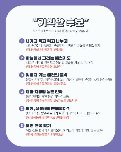 [메이저뉴스] 예천군과 (재)예천문화관광재단은 ‘문화특화지역 조성사업’의 일환으로 운영된 문화기획학교 '문화, 배울 수(水) 있지' 2기의 결과물인 문화기획 아이디어 제안 6건을 대상으로 한 공개투표를 오는 24일까지 진행한다고 밝혔다.