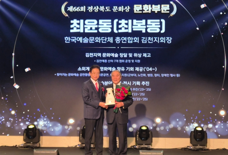 [메이저뉴스]김천시는 지난 23일 안동 스탠포드호텔에서 열린 제66회 경상북도 문화상 시상식에서 최복동 한국예총 김천지회장(문화 부문), 김대철 도문요 대표(시각예술 부문)가 각각 수상했다고 밝혔다.