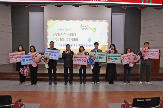 [메이저뉴스] 산청군은 지난 23일 2025년 하반기 적극행정 경진대회에서 1차 사전심사와 2차 대국민 온라인투표, 최종 적극행정위원회 심사를 거쳐 총 8건의 우수사례(최우수 1건, 우수 2건, 장려 2건, 노력 3건)를 선정했다고 밝혔다.