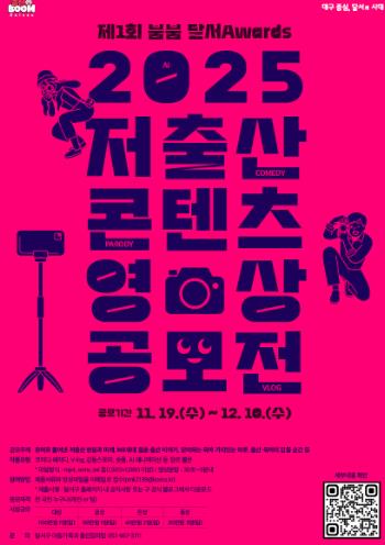 [메이저뉴스]대구 달서구는'출산BooM 달서'프로젝트 일환으로 MZ 청년세대의 저출산 긍정 인식 확산과 참여형 홍보를 위해‘제1회'출산BooM 달서'저출산 콘텐츠 영상 공모전’을 개최한다.