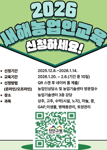 [메이저뉴스]진안군이 ‘2026년 새해농업인 실용교육’ 참여 교육생을 다음달 14일까지 모집한다.