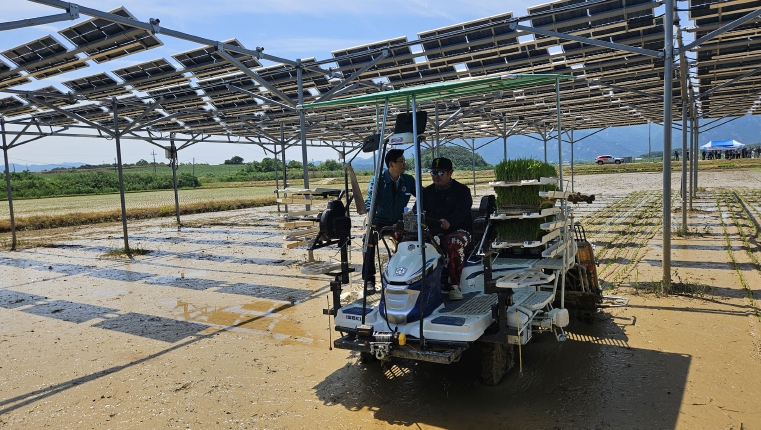 | ▲ 영암군 영농형 태양광 실증 논 벼이양작업 |