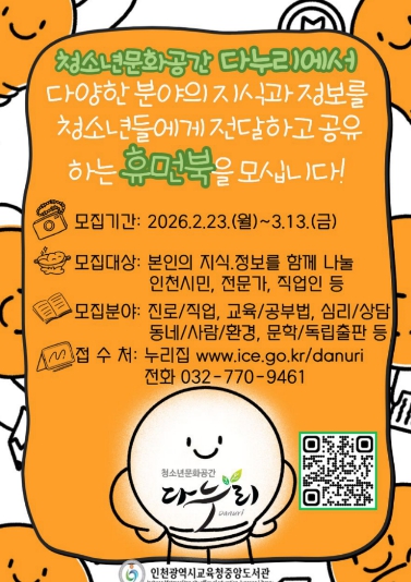 [메이저뉴스]인천광역시교육청중앙도서관청소년문화공간 다누리는 2월 23일부터 3월 13일까지, 재능공유 플랫폼인 사람책 도서관 ‘휴먼 라이브러리’를 함께 이끌어갈 ‘휴먼북(사람책)’을 모집한다.