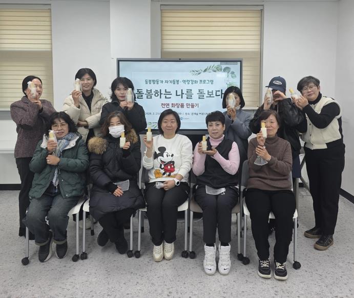 관내 요양보호사, 아이돌보미, 사회복지사 등 돌봄 종사자 10명이 참여했으며, 라온공방 진금숙 대표의 지도로 ‘친환경 천연 화장품 만들기’ 체험형 활동을 진행했다. 참여자들은 천연 재료의 효능을 배우고 피부 자극이 적은 화장품을 제작하며, 이완과 집중의 시간을 가졌다.