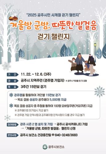 [메이저뉴스]공주시는 시민의 일상 속 걷기 습관 형성과 활성화를 위한 2025년 공주시민 사계절 걷기 챌린지의 마지막 회차 ‘겨울밤 군밤, 따뜻한 발걸음’을 운영한다고 밝혔다.