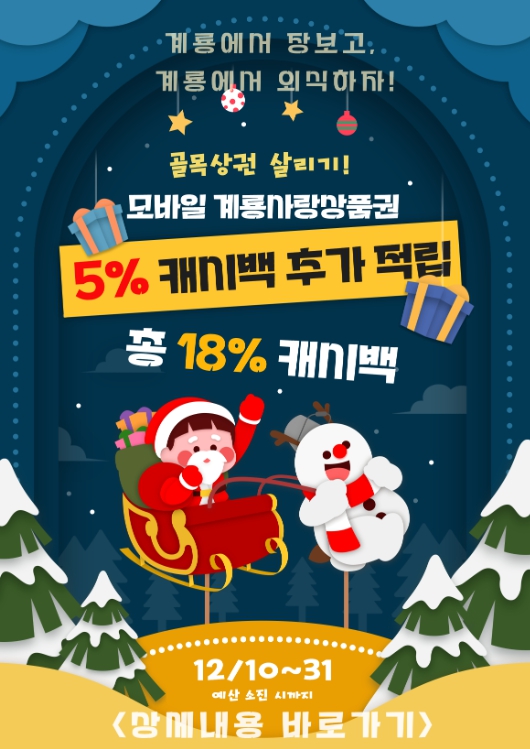 [메이저뉴스]계룡시는 연말을 맞아 지역 소비 촉진과 골목상권 활성화를 위해 10일부터 31일까지(예산 소진 시 조기 종료) 골목상권 가맹점에서 모바일 계룡사랑상품권으로 결제하면 기존 13% 캐시백에 5%를 추가하여 최대 18% 적립 혜택을 제공한다고 밝혔다.