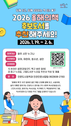 [메이저뉴스]광주 동구는 한 해 동안 시민과 함께 읽을 2026년 ‘책 읽는 동구 올해의 책’ 선정을 위해 후보 도서 추천을 오는 2월 6일까지 접수한다고 밝혔다.