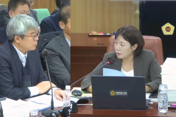 | ▲ 박성연 의원(국민의힘, 광진2, 오른쪽)이 제333회 정례회 도시안전건설위원회 행정사무감사에서 도시기반시설본부장에게 질의하고 있다. |