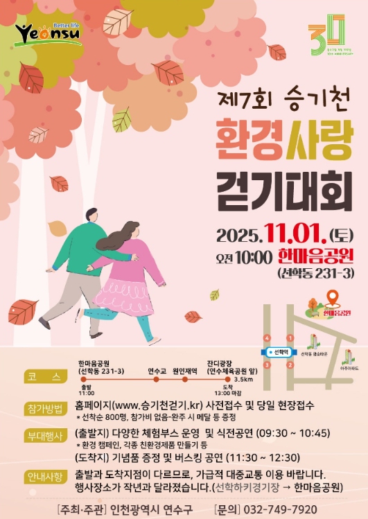 [메이저뉴스] 연수구는 오는 11월 1일 오전 10시 한마음공원(선학동 231-3) 및 승기천 일원에서 구민과 함께 자연 속에서 걷는 ‘제7회 승기천 환경사랑 걷기대회’를 개최한다.