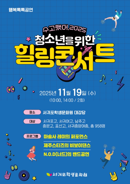[메이저뉴스]제주도교육청 서귀포학생문화원은 19일 서귀포학생문화원 대강당에서 행복톡톡 공연 ‘수고했어 2025, 청소년을 위한 힐링콘서트’를 오전 10시와 오후 2시 두 차례에 걸쳐 개최한다.