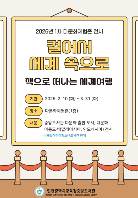[메이저뉴스]인천광역시교육청중앙도서관은 2월 10일부터 3월 31일까지 1층 다문화체험존에서 ‘책으로 떠나는 세계여행’ 전시를 개최한다.