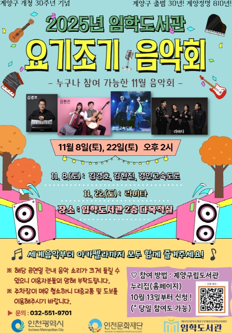 [메이저뉴스]인천 계양구 임학도서관(관장 권경회)에서 지역 주민을 대상으로 ‘요기조기 음악회’를 개최한다.