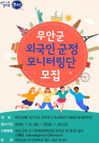 [메이저뉴스]무안군은 외국인주민의 안정적인 지역 정착과 사회통합을 위해 2026년 '외국인주민 군정 모니터링단'을 신규 모집한다고 밝혔다.