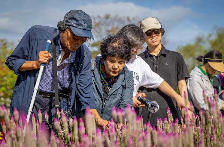 ▲ 지난 17일 「사운드순천」에 참가한 시각장애인들이 순천만국가정원에서 꽃을 느껴보고 체험하고 있다.j |