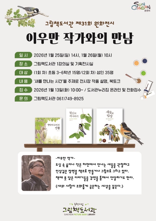 [메이저뉴스]순천시는 제31회 그림책 원화전시와 연계해 생태 세밀화가이자 그림책 작가인 이우만 작가를 초청해 작가와의 만남을 운영한다.