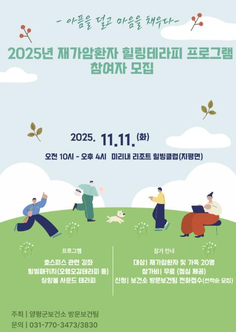 [메이저뉴스]양평군은 재가암환자와 그 가족을 대상으로 ‘2025년 재가암환자 힐링테라피 프로그램’ 대상자를 모집한다고 밝혔다. 프로그램은 오는 11월 11일, 양평 미리내 리조트 내 힐빙클럽에서 진행될 예정이며, 총 20명을 모집한다.