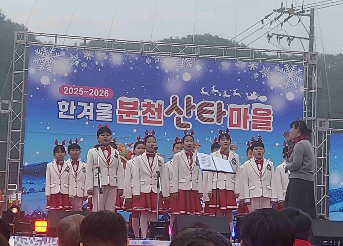 [메이저뉴스]봉화군 소천면 분천산타마을에서 지난 20일(토) 개최된 ‘2025 한겨울 분천산타마을 개장식’ 이 지역주민과 관광객들의 열띤 호응 속에 성황리에 열렸다. 이번 개장 축하공연에는 봉화교육지원청이 운영하는 봉꽃송이 청소년 합창단이 참여하여 한겨울 추위를 녹이는 따뜻한 무대를 선사했다.