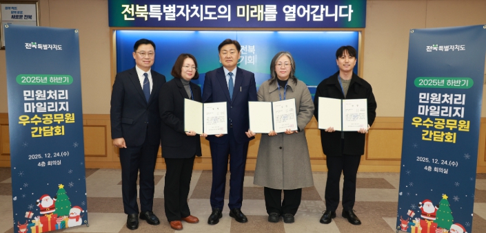 [메이저뉴스]전북특별자치도가 24일 '2025년 하반기 민원 처리 우수직원 시상 및 간담회'를 개최하고, 신속하고 성실한 민원 업무 수행으로 높은 평가를 받은 직원들을 격려했다.