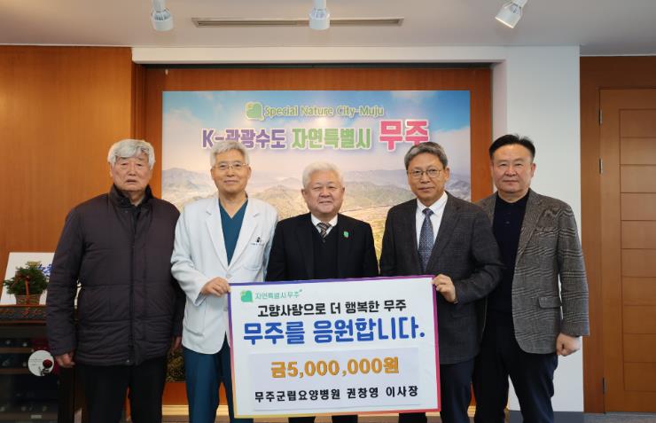 [메이저뉴스]무주군으로부터 무주군립요양병원을 위탁받아 운영하는 (사)소산 권창영 이사장이 고향사랑기부금 5백만 원을 기탁했다. 이날 기탁식에는 권도훈 무주군립요양병원장과 임원진 등 4명이 함께 해 의미를 더했다.