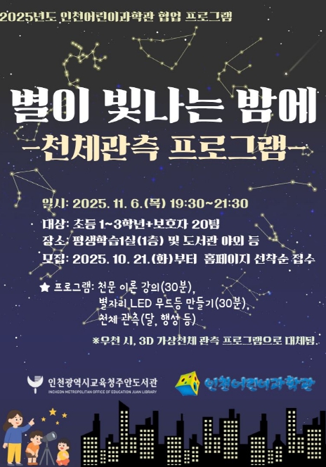 이번 프로그램은 지난해 체결된 인천어린이과학관과의 업무협약에 따라 진행되는 협업 사업으로, 11월 6일 오후 7시 30분부터 9시 30분까지 주안도서관 평생학습 1실과 야외에서 진행된다.