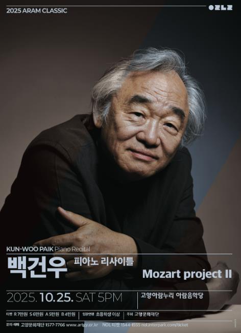 [메이저뉴스]모차르트의 세계를 통해 자신의 음악 인생을 되돌아보는 피아니스트 백건우가 오는 10월 25일 오후 5시, 고양아람누리 아람음악당 무대에 오른다. 이번 공연은 2024년부터 이어온 ‘모차르트 프로젝트’의 두 번째 시즌으로, 전국 17개 도시에서 순회 중인 〈백건우와 모차르트 – Mozart Project Ⅱ〉의 일환이다.