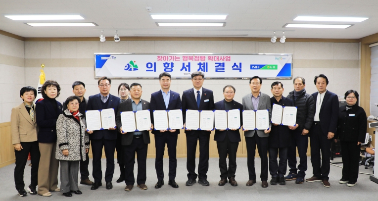 [메이저뉴스]함양군은 30일, 군청 소회의실에서 ‘찾아가는 행복점빵’ 확산을 위해 농협중앙회 함양군지부와 5개 지역농협이 참여하는 사업 추진 의향서 체결식을 가졌다.