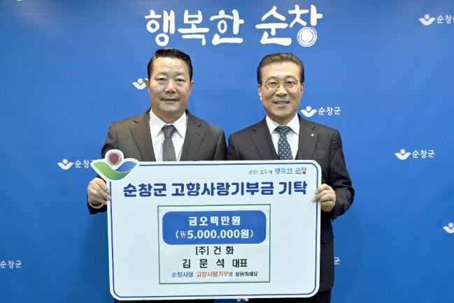 [메이저뉴스]순창군은 15일 ㈜건화 김문석 대표이사가 순창군에 고향사랑기부금 500만원을 기탁했다고 밝혔다.