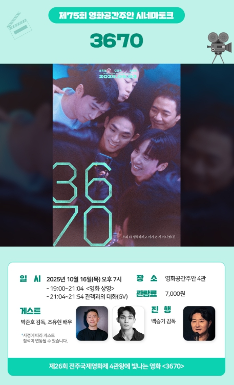 영화공간주안 관계자는 “‘3670’은 진정성 있는 서사와 배우들의 열연이 돋보이는 작품으로, 감독과 배우가 직접 참여해 관객과 생생한 대화를 나누는 뜻깊은 시간이 될 것”이라며 지역 주민들의 많은 참여를 당부했다.