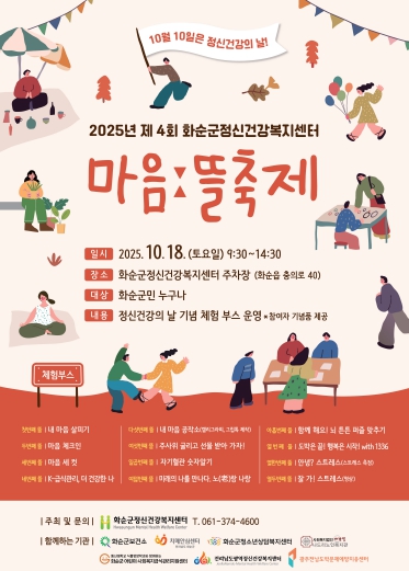 이번 축제는 화순군정신건강복지센터에서 10월 18일 오전 9시 30분부터 오후 2시 30분까지 열리며, 지역 주민 누구나 무료로 참여할 수 있다.