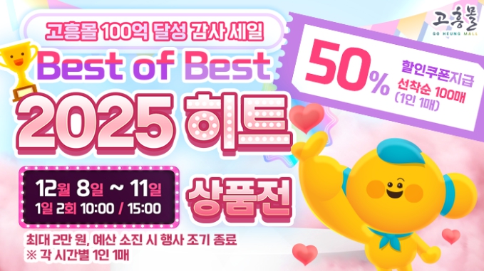 [메이저뉴스]고흥군은 직영 온라인 농수축특산물 쇼핑몰 ‘고흥몰’이 누적 매출 100억 원 돌파를 기념해 오는 1월 8일부터 11일까지 ‘100억 달성 감사 세일–2025 Best of Best’ 기획전을 진행한다고 밝혔다.