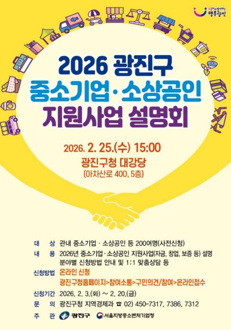 [메이저뉴스]광진구가 2월 25일 광진구청 대강당에서 서울지방중소벤처기업청과 함께 ‘2026 광진구 중소기업‧소상공인 지원사업 설명회’를 개최한다.