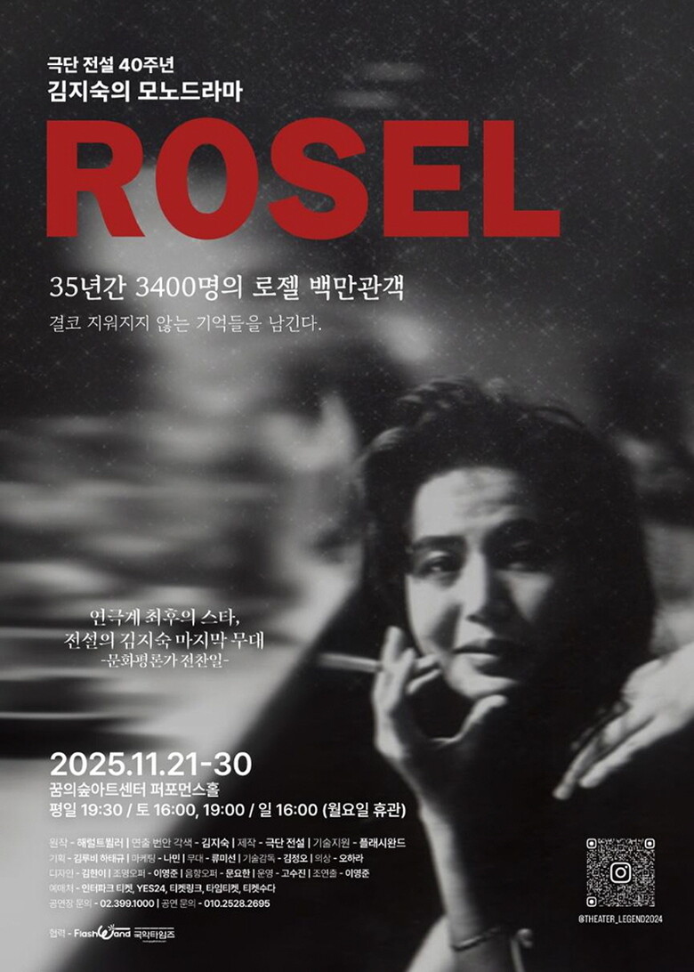 [메이저뉴스]극단 전설 40주년 기념작이자 배우 김지숙의 마지막 공연인 모노드라마 〈로젤〉이 오는 11월 21일부터 30일까지 꿈의숲아트센터 퍼포먼스홀에서 막을 올린다. 35년간 3,400회 이상 공연되며 백만 명이 넘는 관객을 울린 이 작품은 여성의 주체성과 인간성의 회복을 그린 한국 연극사의 대표작으로 꼽힌다.