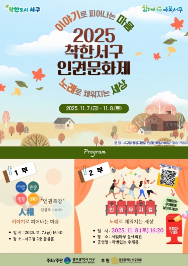 [메이저뉴스]광주광역시 서구가 주민 참여 기반 인권문화 정착에 박차를 가한다. 서구는 오는 7일과 8일 이틀간 ‘이야기로 피어나는 마음, 노래로 채워지는 세상’을 주제로 ‘2025 착한서구 인권문화제’를 개최한다.