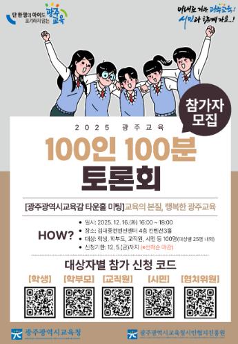 [메이저뉴스]광주시교육청시민협치진흥원은 오는 12월 16일 김대중컨벤션센터 4층 컨벤션홀에서 ‘2025 광주교육 100인 100분 토론회’를 개최한다.