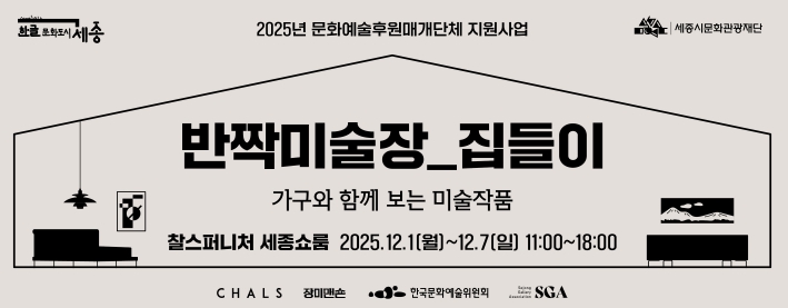 [메이저뉴스] 세종시문화관광재단(대표이사 박영국)은 세종화랑협회, (주)찰스와 함께 만드는 협업 전시 ‘반짝 미술장_집들이’를 12월 1일부터 7일까지 찰스퍼니처 세종 쇼룸에서 개최한다고 밝혔다. 이번 전시는 ‘집’을 주제로 한 공간형 전시이자, 지역 시각예술을 생활공간 속에서 자연스럽게 경험하도록 기획된 미술시장형 프로그램이다.