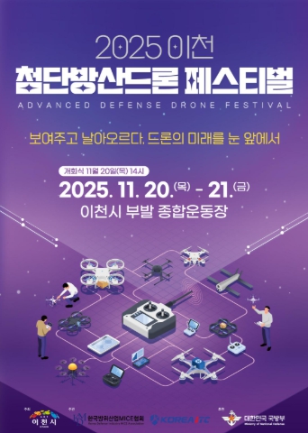 ‘보여주고, 날아오르다 – 드론의 미래를 눈앞에서’라는 슬로건 아래 열리는 이번 행사는 국내외 첨단 드론 기업들이 참여해 국방, 산업, 물류 등 다양한 분야의 드론 기술을 선보이는 실증형 전시회로 진행된다. 특히 올해 처음으로 개최되는 이번 페스티벌은 드론 산업의 기술력과 발전 방향을 한눈에 볼 수 있는 자리로, 이천시가 미래 첨단산업 중심 도시로 도약하는 계기가 될 것으로 기대된다.