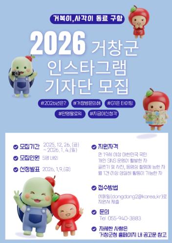 [메이저뉴스] 거창군은 지역 관광자원의 매력을 생생하게 전달하고 온라인 홍보를 강화하기 위해 ‘2026년 거창군 인스타그램 기자단’을 모집한다고 26일 밝혔다.