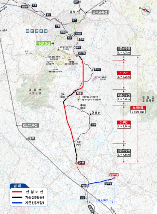 이번 사업은 총사업비 약 9천 2백억원을 투입하여 대전 가수원역에서 논산역까지의 굴곡진 노선을 직선화하고, 기존 노후 시설도 정비하여 250km/h의 고속 주행이 가능한 선로로 개량하는 국책 사업이다.