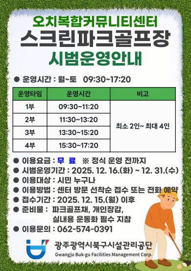 [메이저뉴스]광주광역시북구시설관리공단은 오치복합커뮤니티센터 4층에 북구 관내 최초의 공공 실내 스크린파크골프장을 조성하고, 오는 16일 시범운영에 들어간다고 밝혔다.